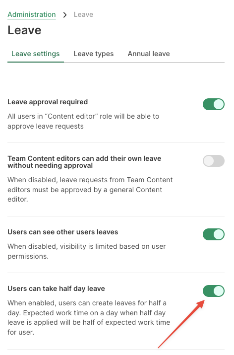 When leave approval is enabled all leaves need to be approved by one of the users in the role "Content editor".