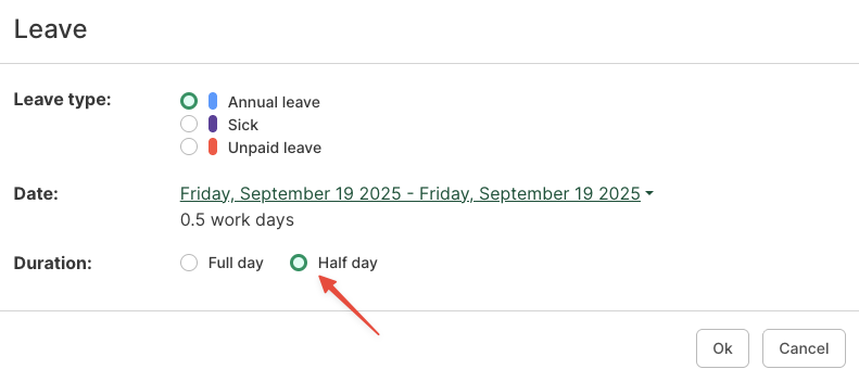 Some countries support taking half-day leaves and you can enable this in Administration → Leave settings.