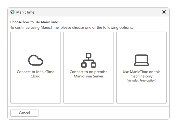 Choose "Connect to on premise ManicTime Server". If you already have ManicTime installed, then open ManicTime, go to Tools and settings -> Server settings or Connect to Cloud\Server.