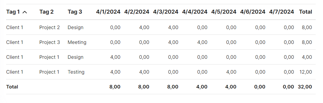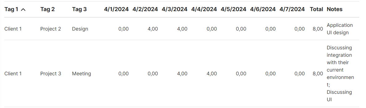 From this view I can clearly see that I worked on Client 1, Project 1, Testing on Monday, Tuesday and Friday, a total of 12hrs.