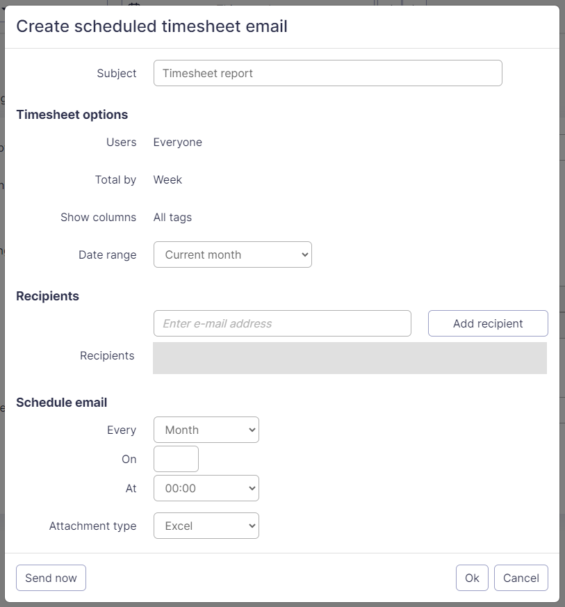 On the "Create scheduled timesheet email" form you can choose some settings: