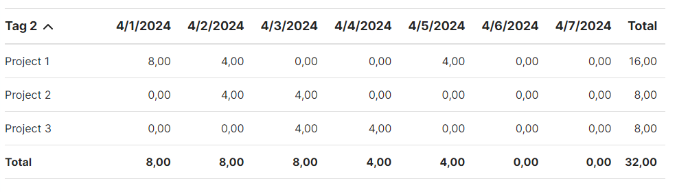 In ManicTime tags are separated by comma. So we could say that tag 'level 1, level 2, level 3' is three levels deep. In the sample data, second tags were always projects, so in the field Group by I can now choose Second level tags instead of All tags. This will produce the following output: