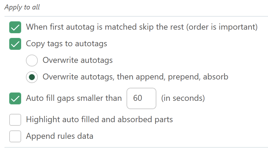 When checked, all tags will be be copied to autotags timeline. There are two options how tags are transferred to autotag timeline: