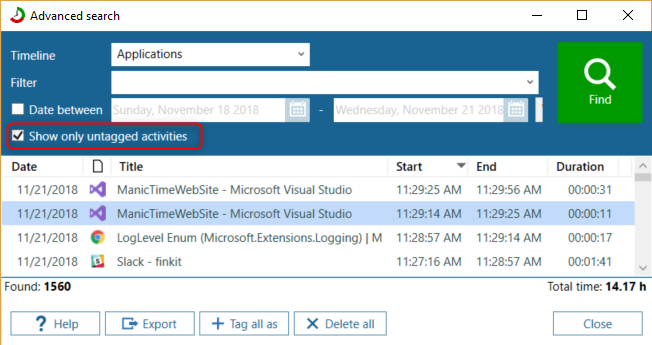The search will list all untagged activities. You can double-click any activity to open it in Day view or tag it directly within Advanced Search.