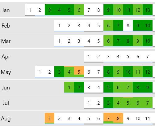 Each day is represented by a rectangle that combines light green and orange if both tagged and untagged time exist. For example, if most of the day is tagged (e.g. 5 hours tagged, a few seconds untagged), the rectangle will mostly appear light green. If no time is tagged on a given day, the entire rectangle will be orange.